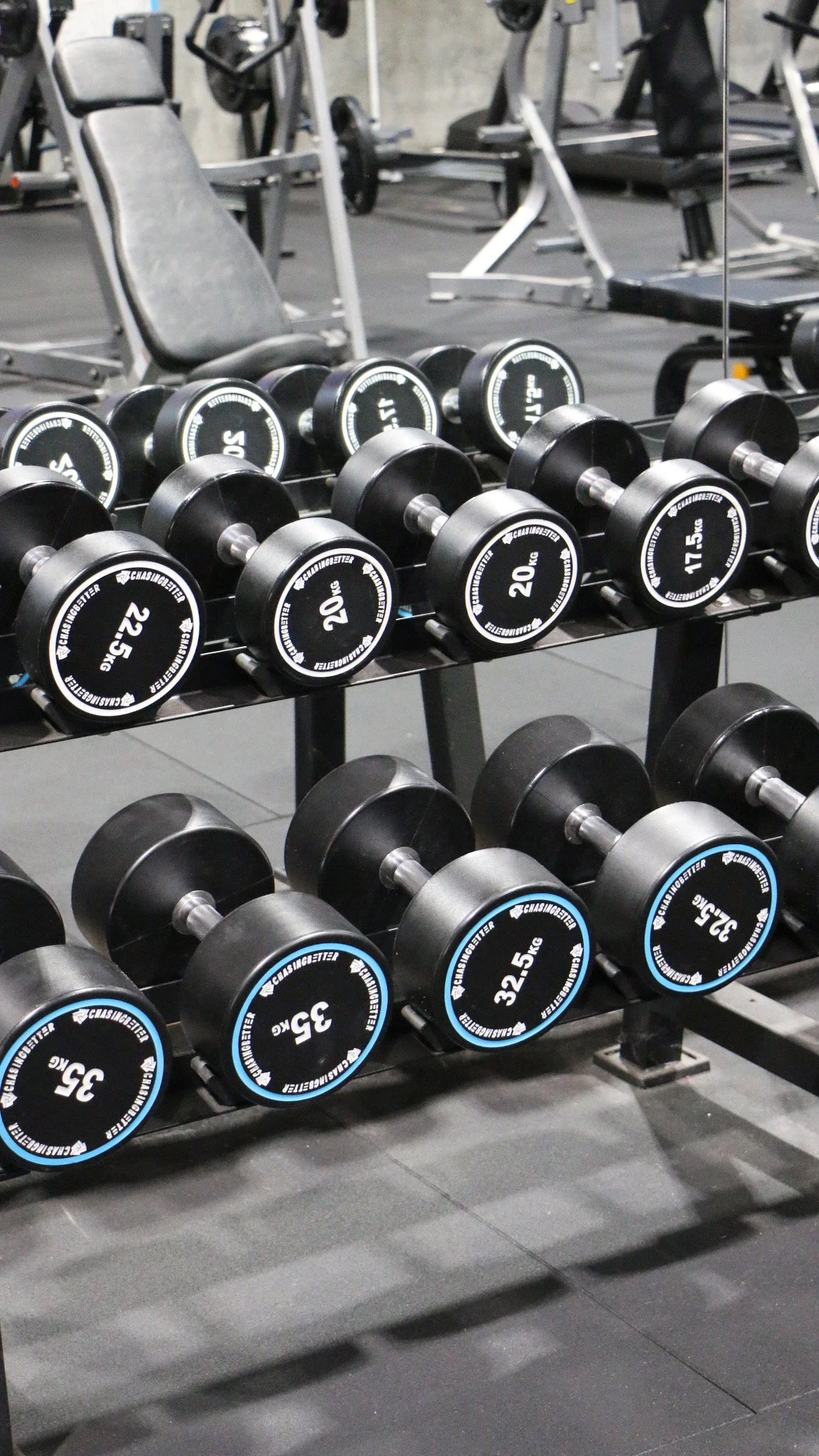 Set of black dumbbells with white and blue labels on a rack in a gym, with workout equipment and a chair in the background.