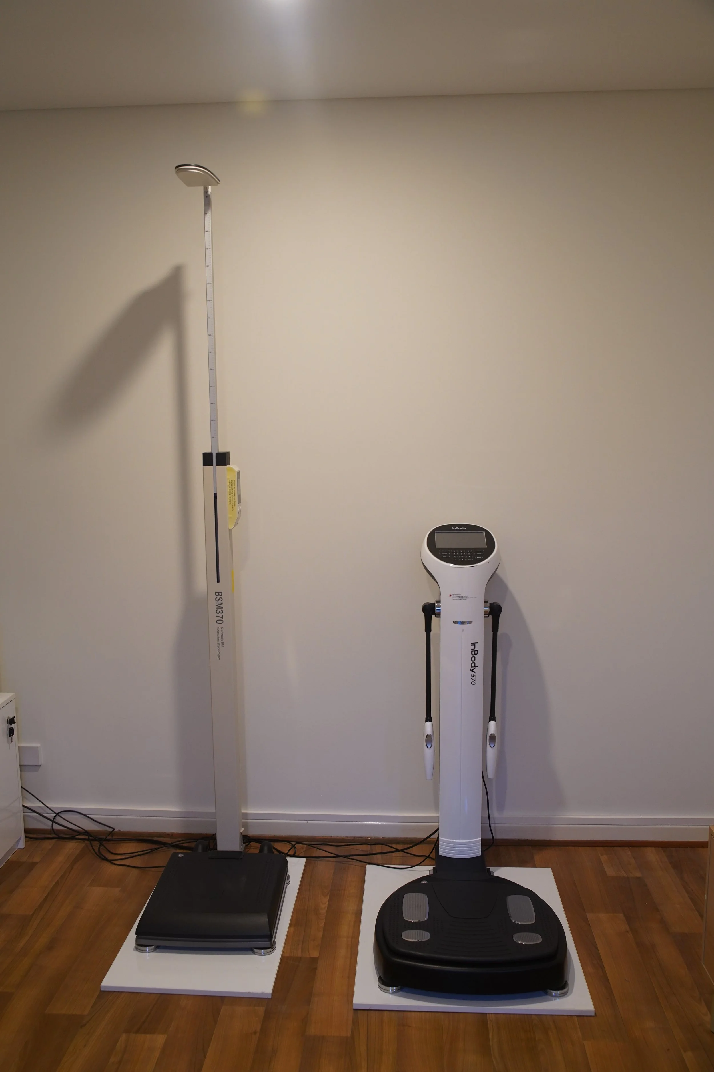 Medical fitness equipment, including a height scale with a measuring rod and a body composition analyzer, situated against a plain wall on a hardwood floor.